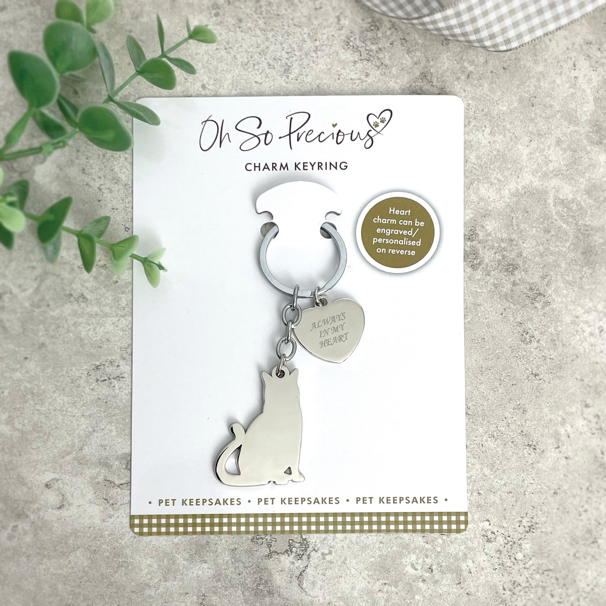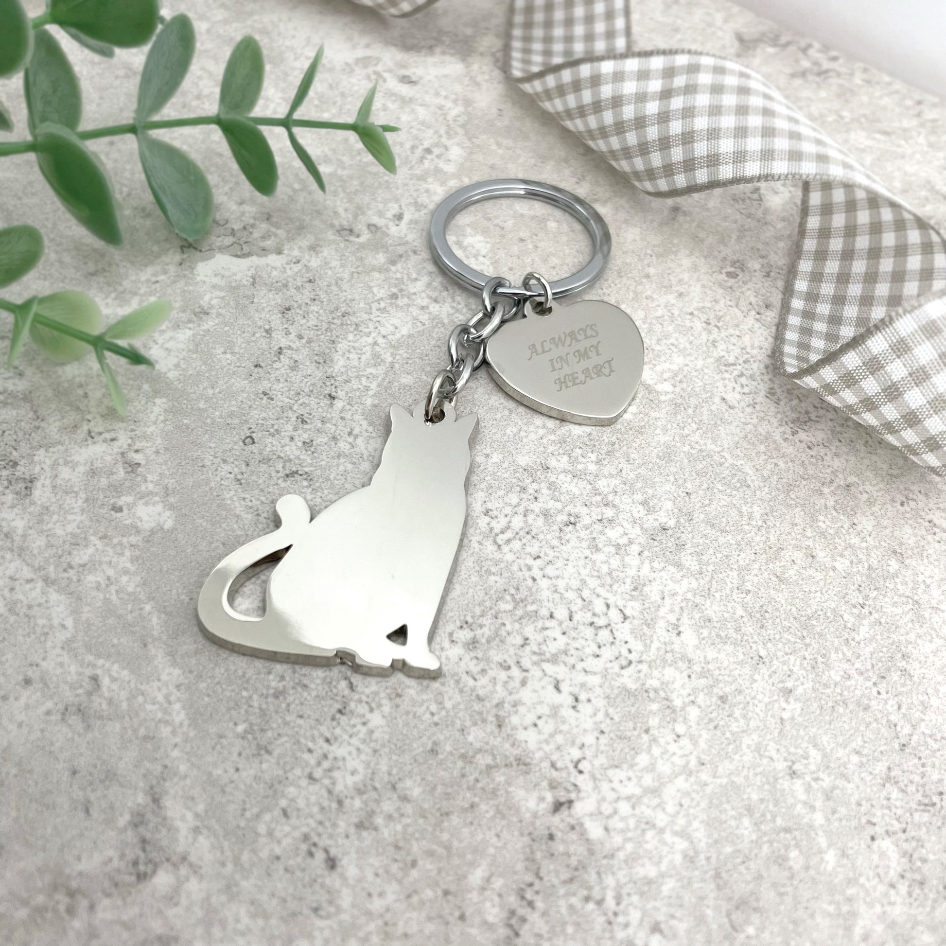 This sturdy stainless steel keyring features a silhouette cat shape and a heart shaped charm with the wording 'Always in my heart' engraved on, offering some comfort to anyone who has recently loved and lost a beloved cat.