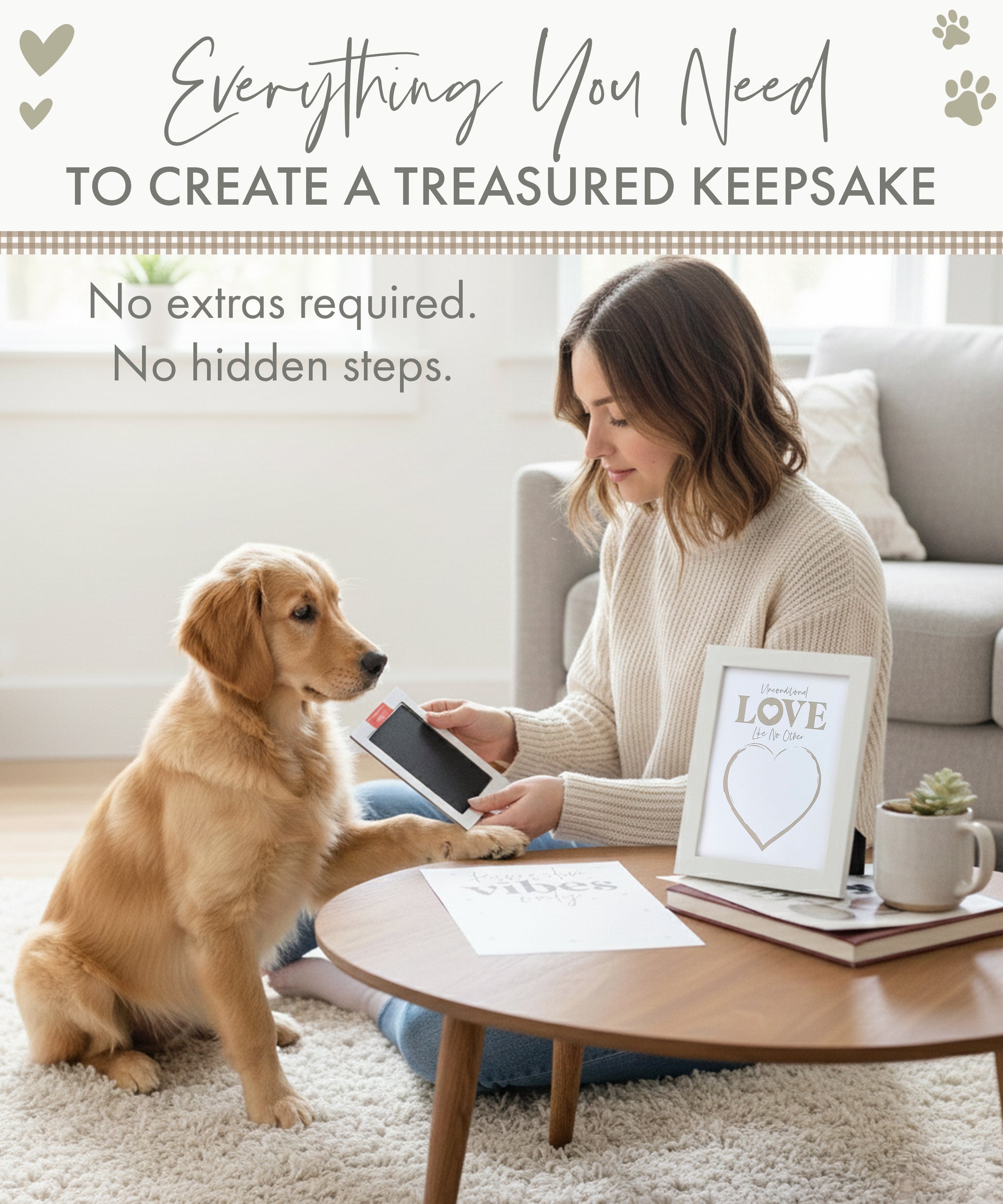 Use our safe, pet-friendly ink pad to capture your furry friend's paw print (no ink will touch your pets paw!), once dried you can then frame it in the white frame which is included.