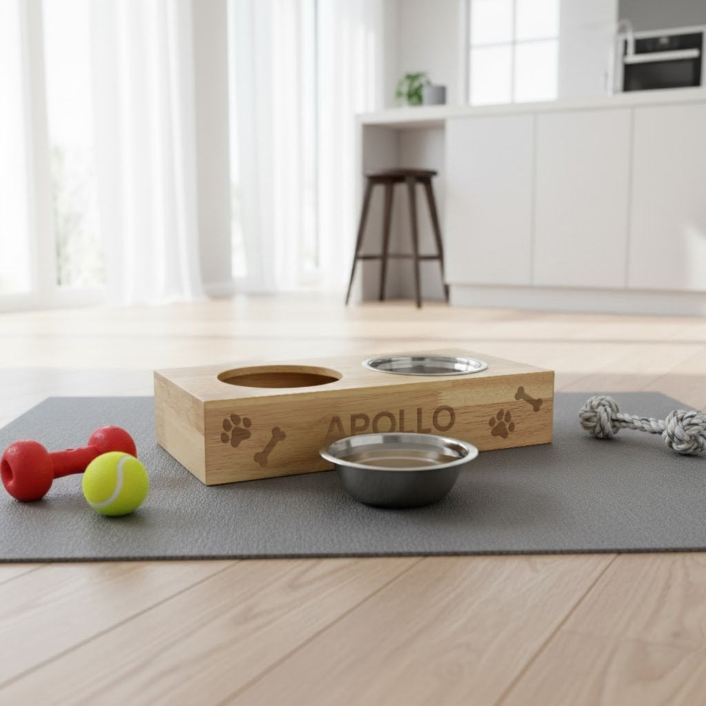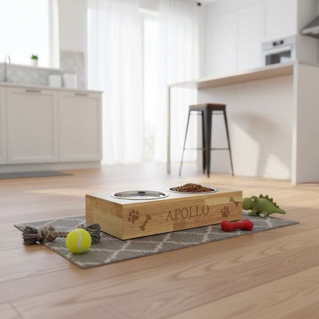 Add your dog’s name which will be beautifully laser-engraved into the wooden stand for a lasting, premium finish.