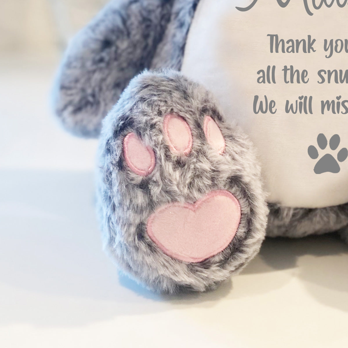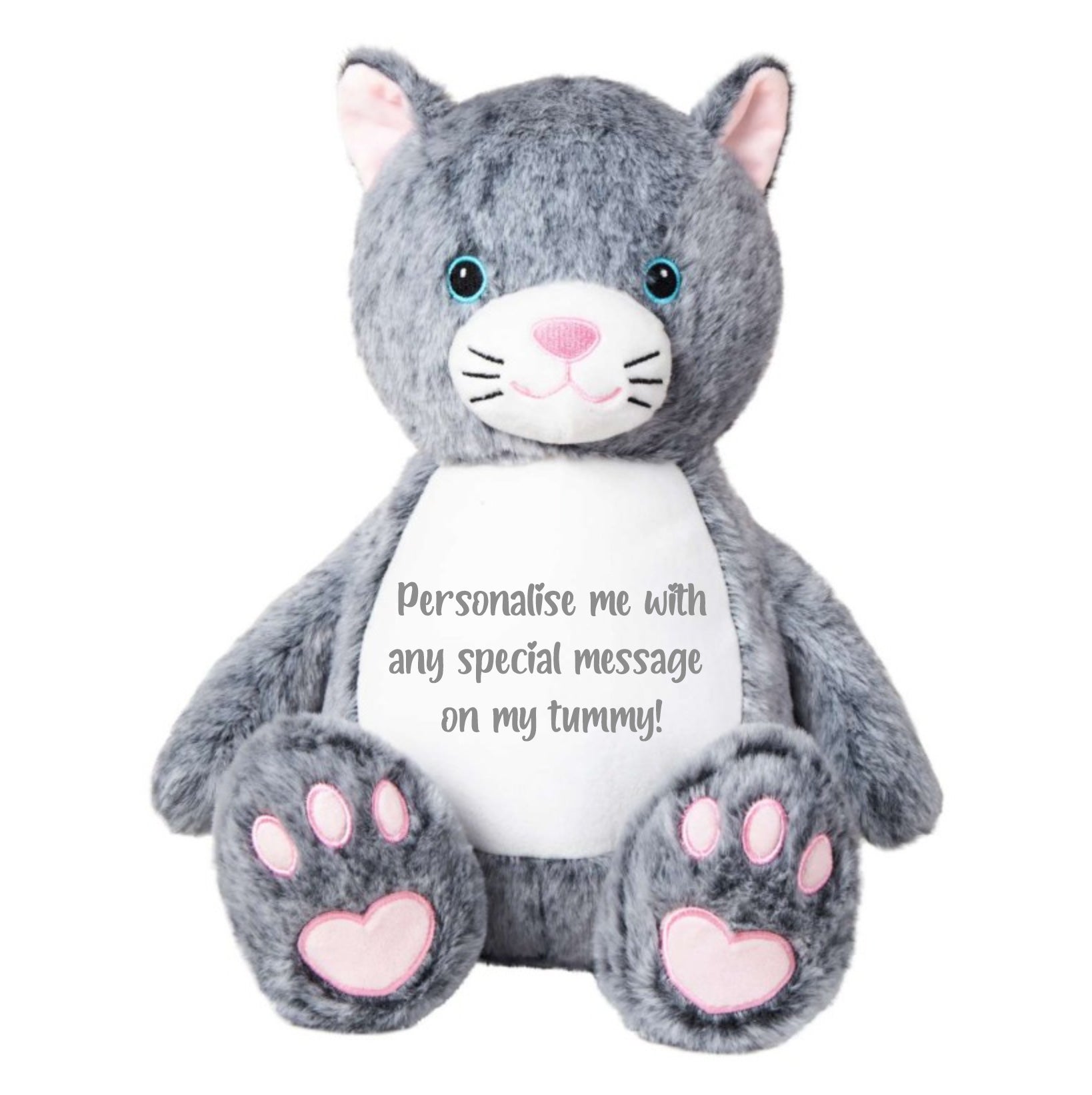 The cats tummy can be personalised with any name and a message over 3 lines (max 20 characters on each). There is a paw print as standard underneath the text.