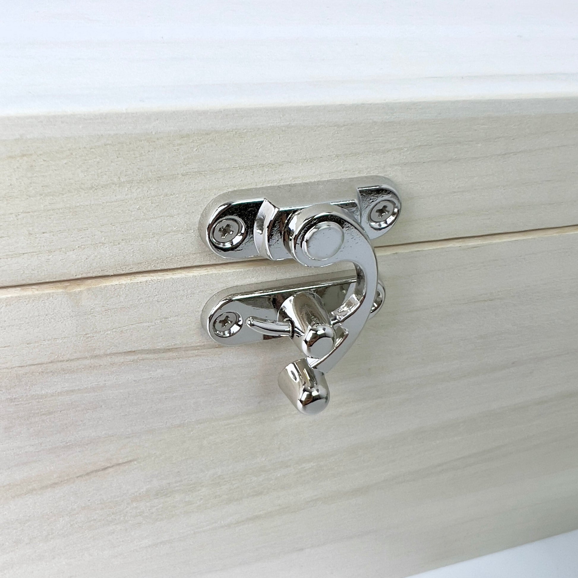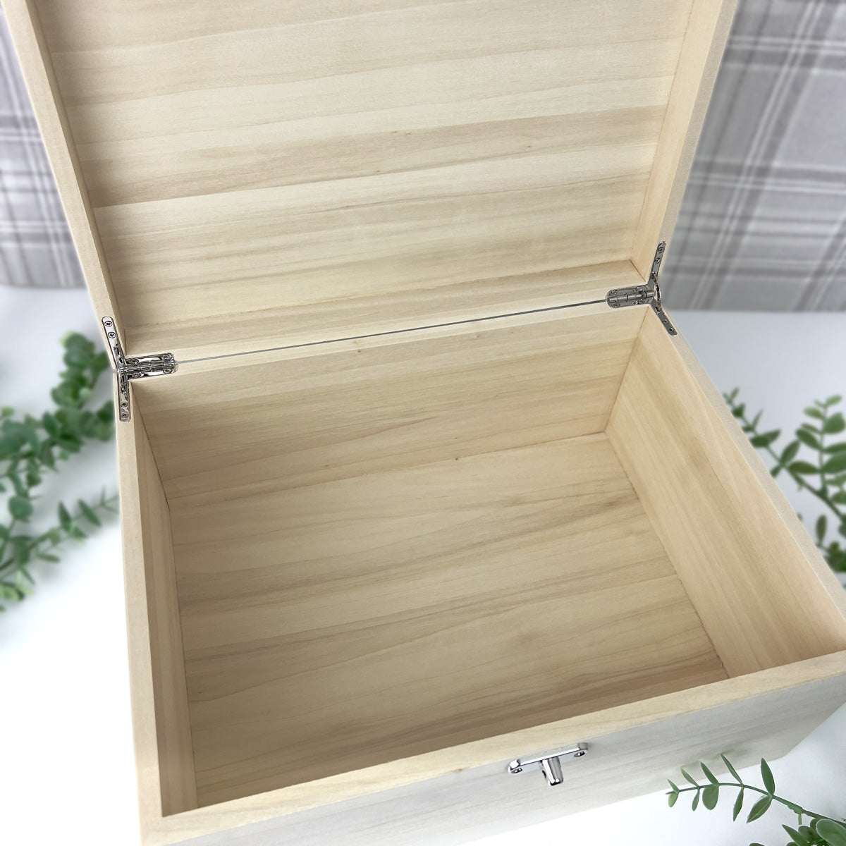 The box is natural wood and may have slight imperfections, it has chrome plated metal hinges and a metal clasp to seal the box ensuring its contents are safe for years to come.