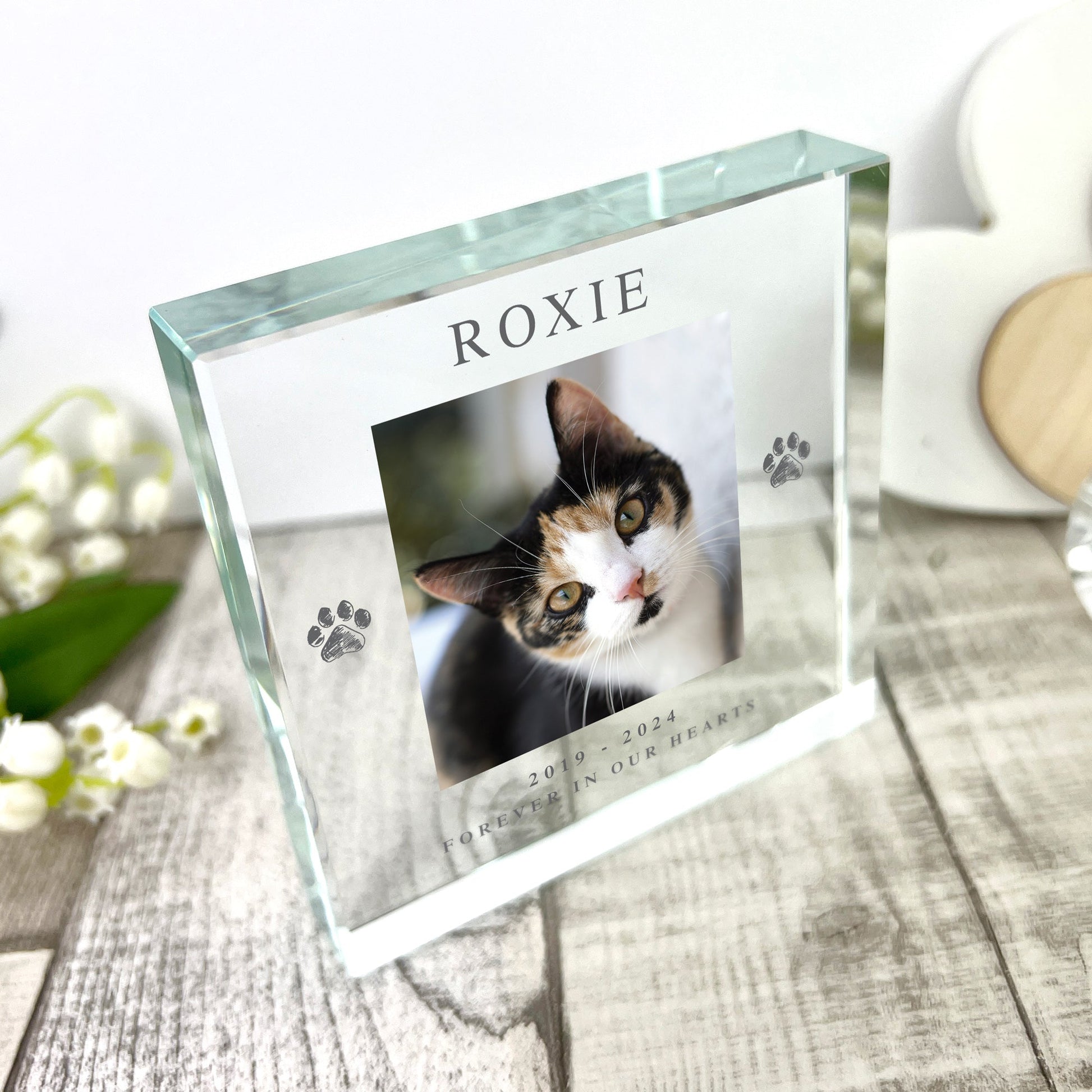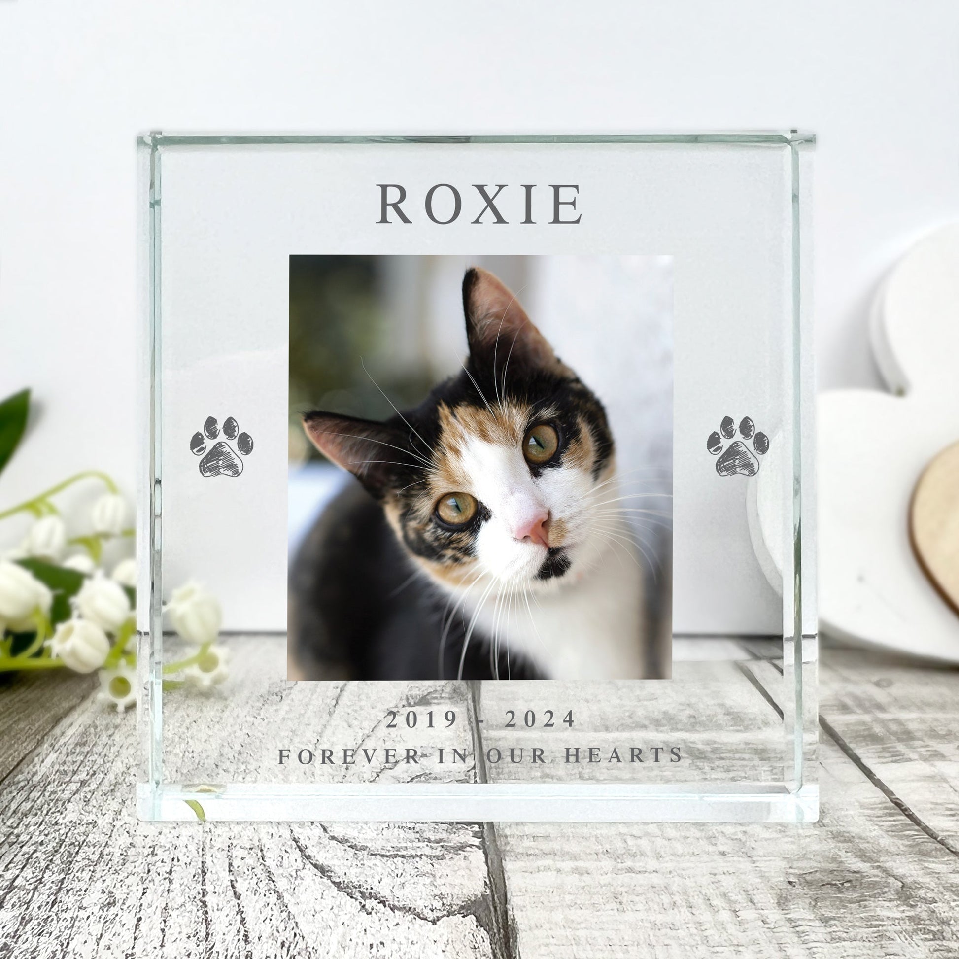 This special memento is a freestanding crystal token that celebrates the memory of your beloved pet, who you miss dearly. It showcases your pet's photo, with a paw motif on either side. Personalise it with a favourite photo, their name, dates, and a short message. Customise this keepsake to honour your loyal and devoted companion.