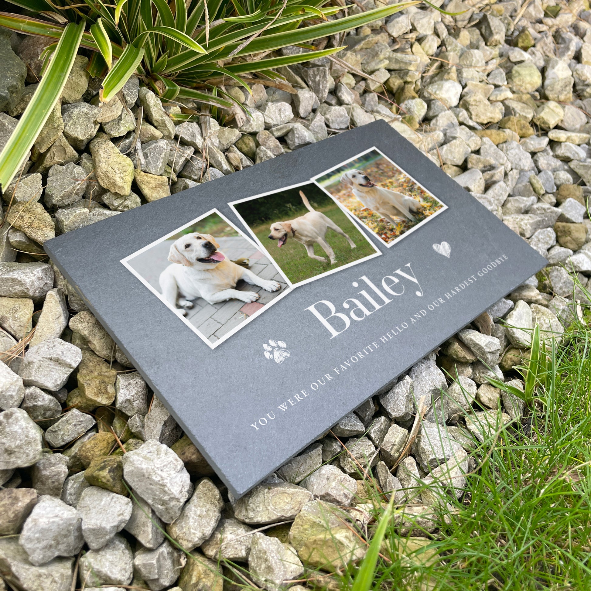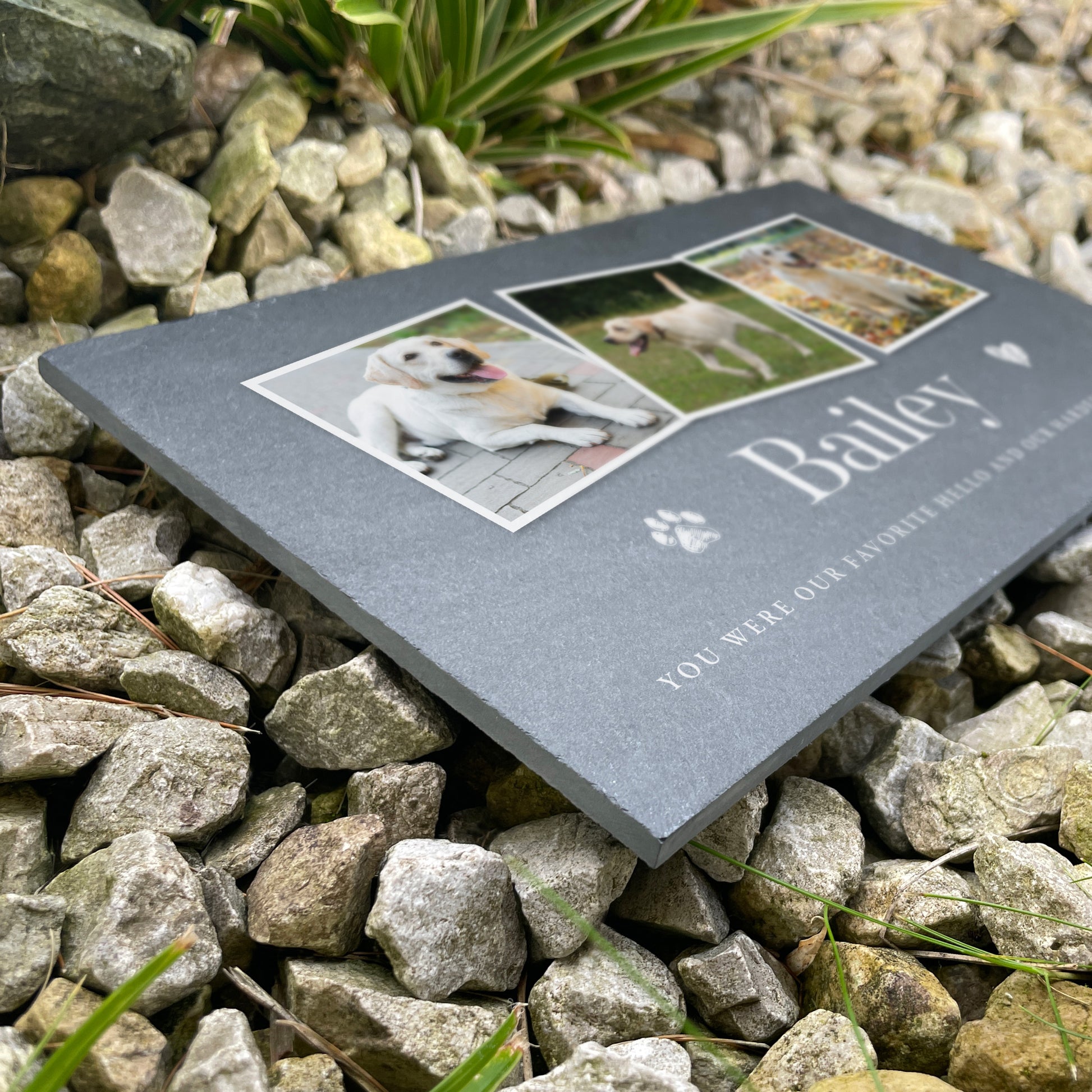 Create a heartfelt tribute to your beloved pet with this customised slate grave marker. Featuring three cherished photos of your furry companion, their name, and a heartfelt message or verse, this durable slate marker can be placed anywhere in your home, garden, or memorial. The included sketchy heart and paw print give a special touch to the 25cm x 15cm grave marker.
