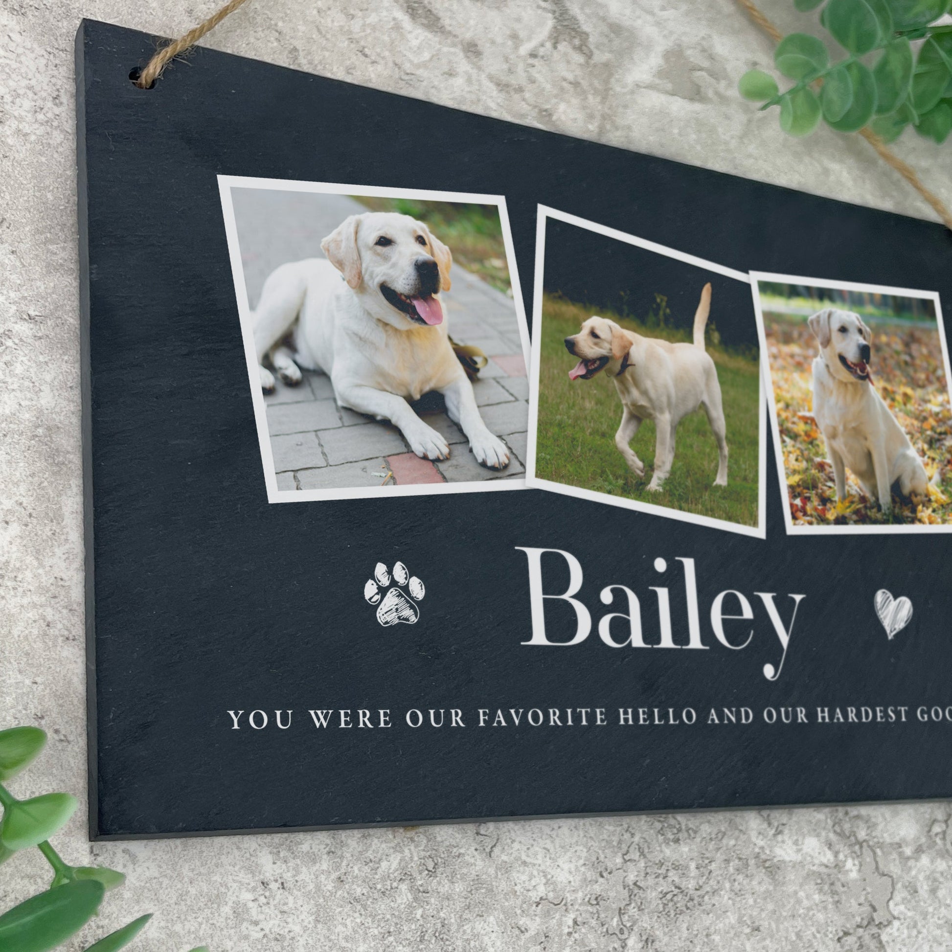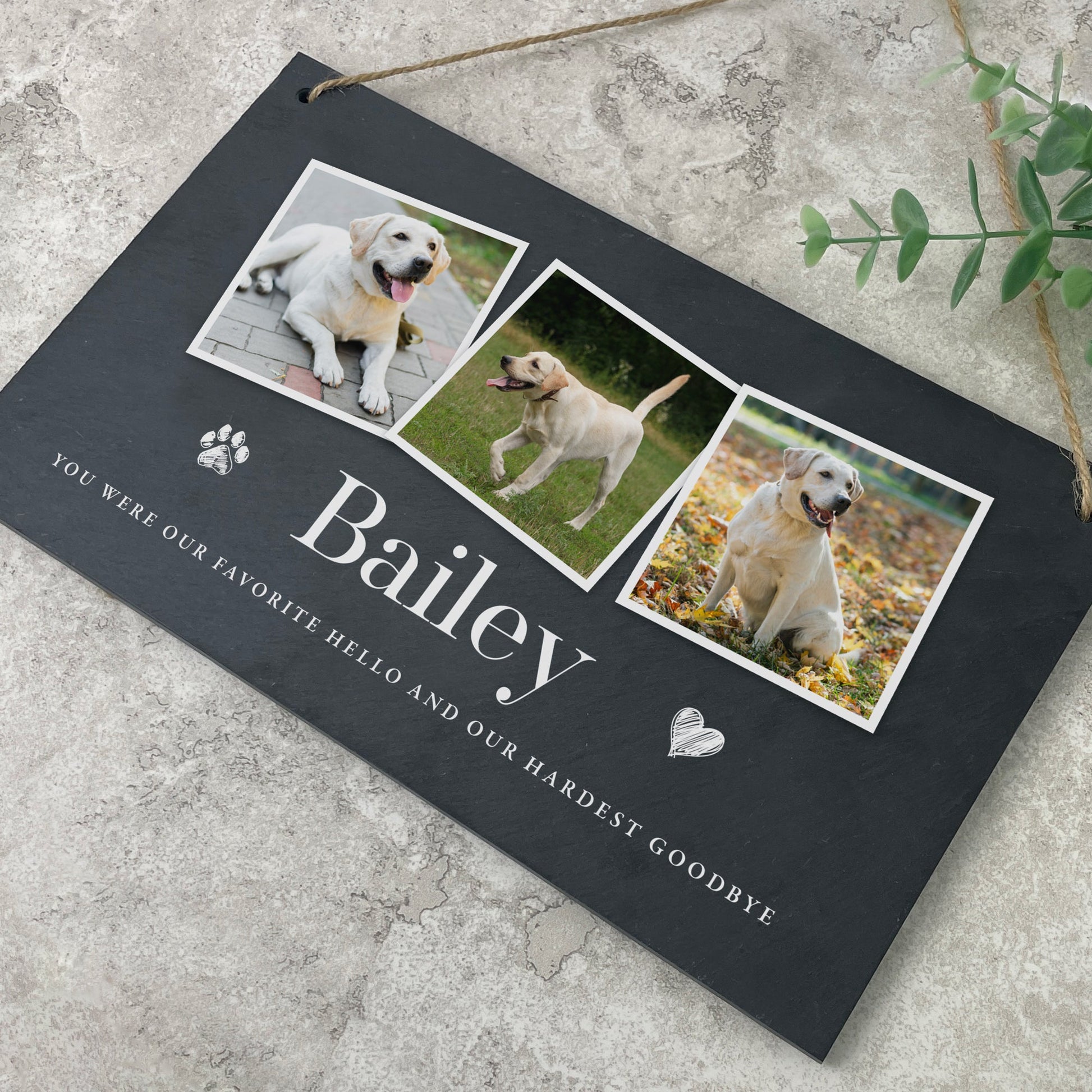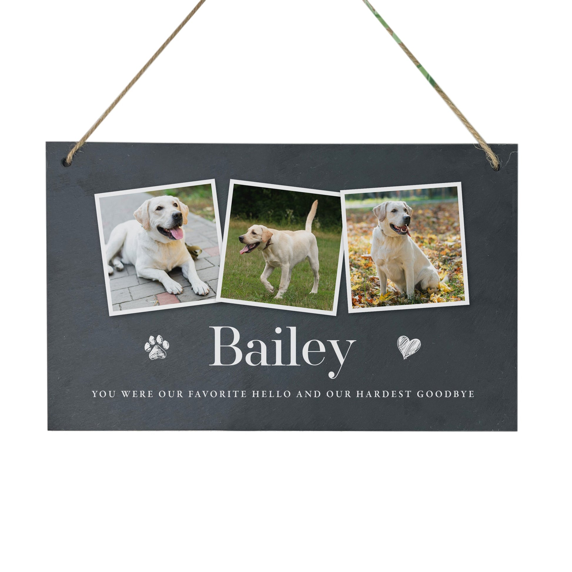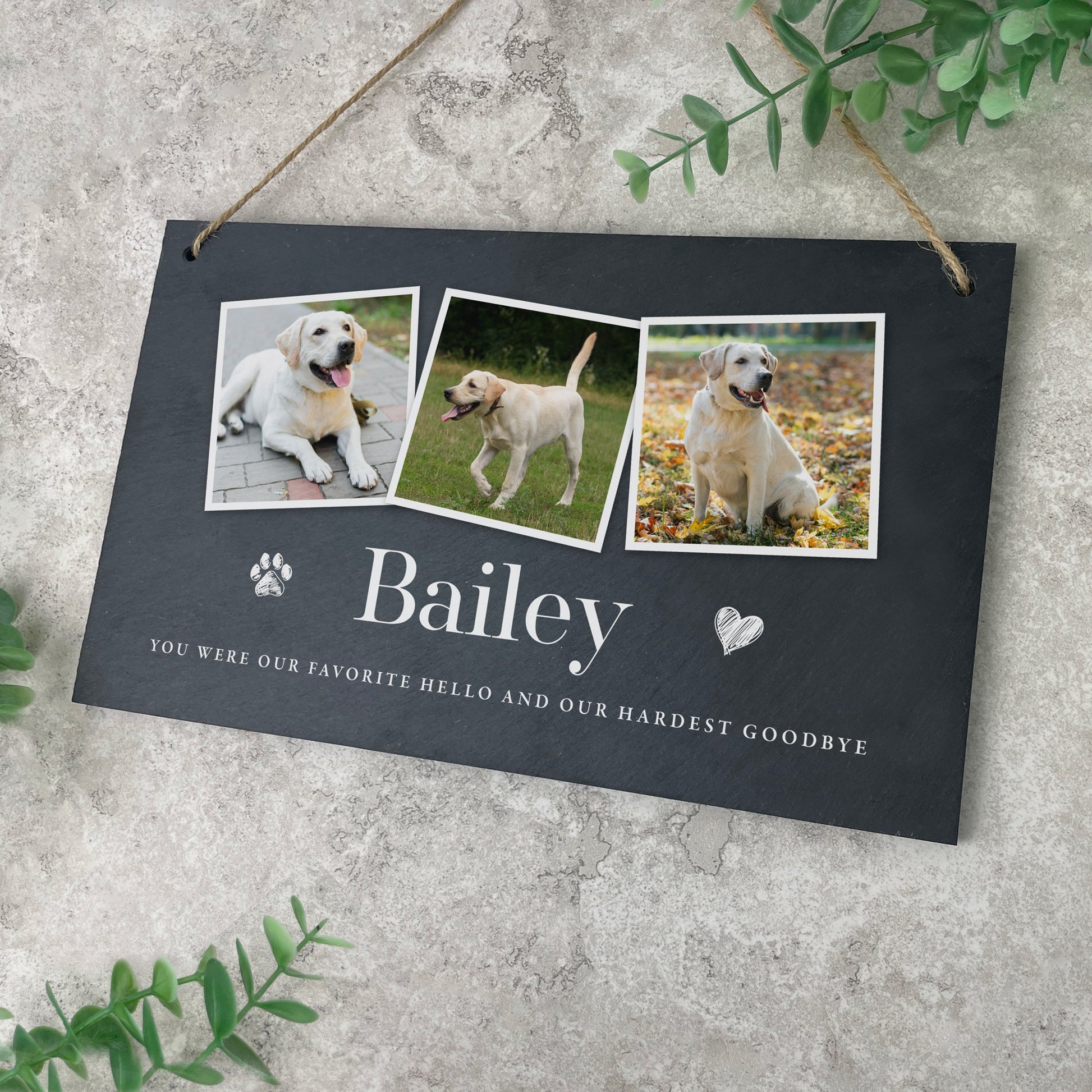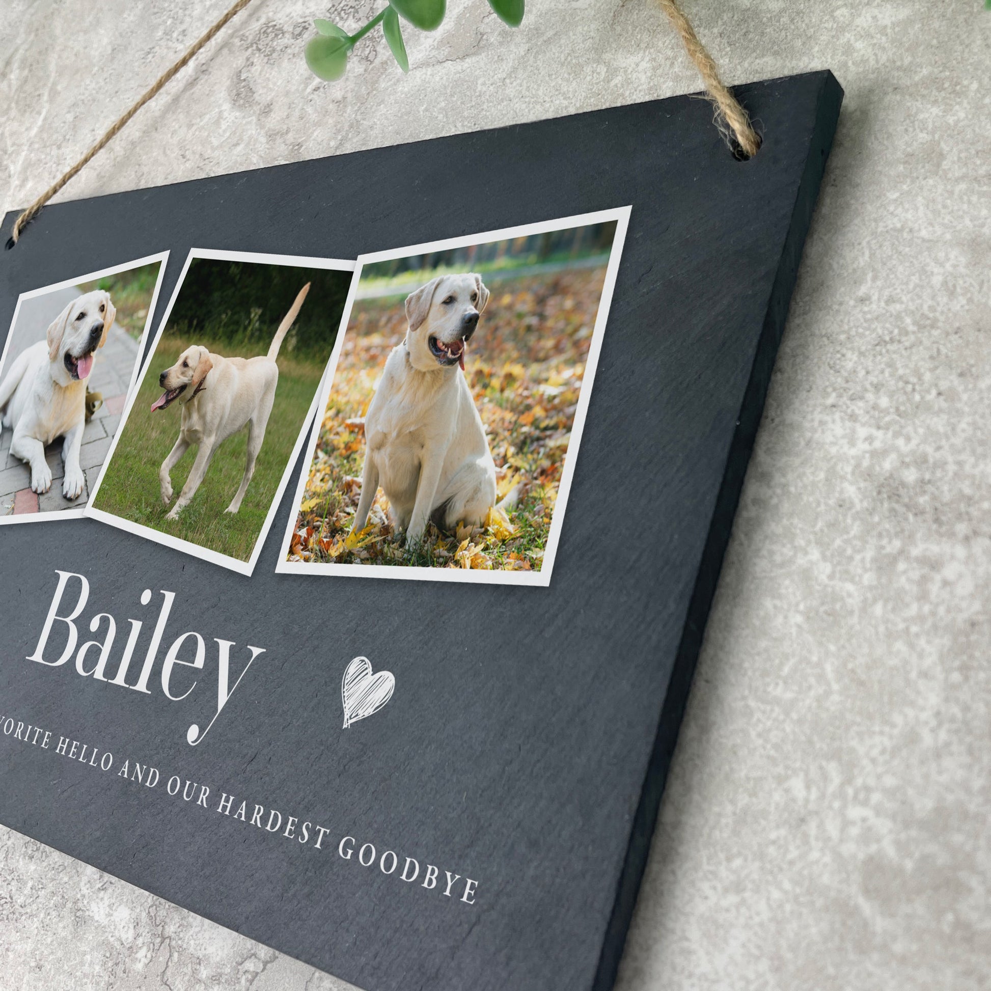 Make any space in your home, garden, or memorial special for your beloved pet with this personalised plaque. Show off three treasured photos of your furry friend, along with their name and a heartfelt message or verse, on a durable slate surface.