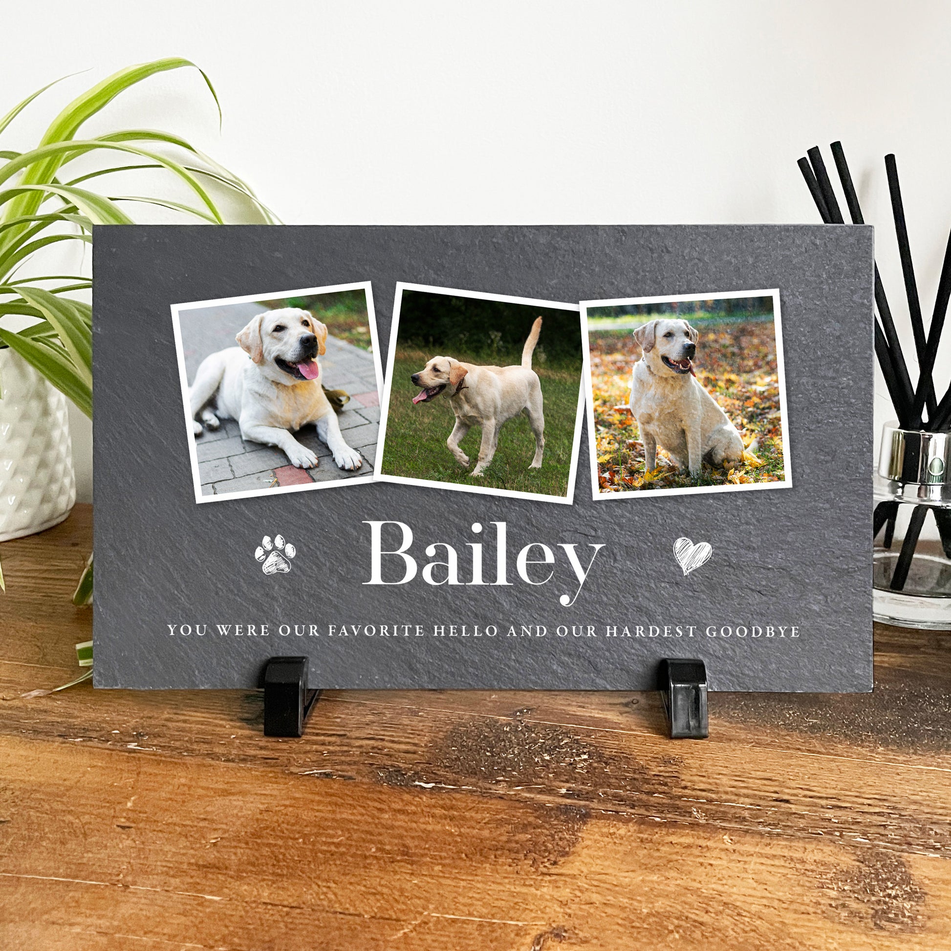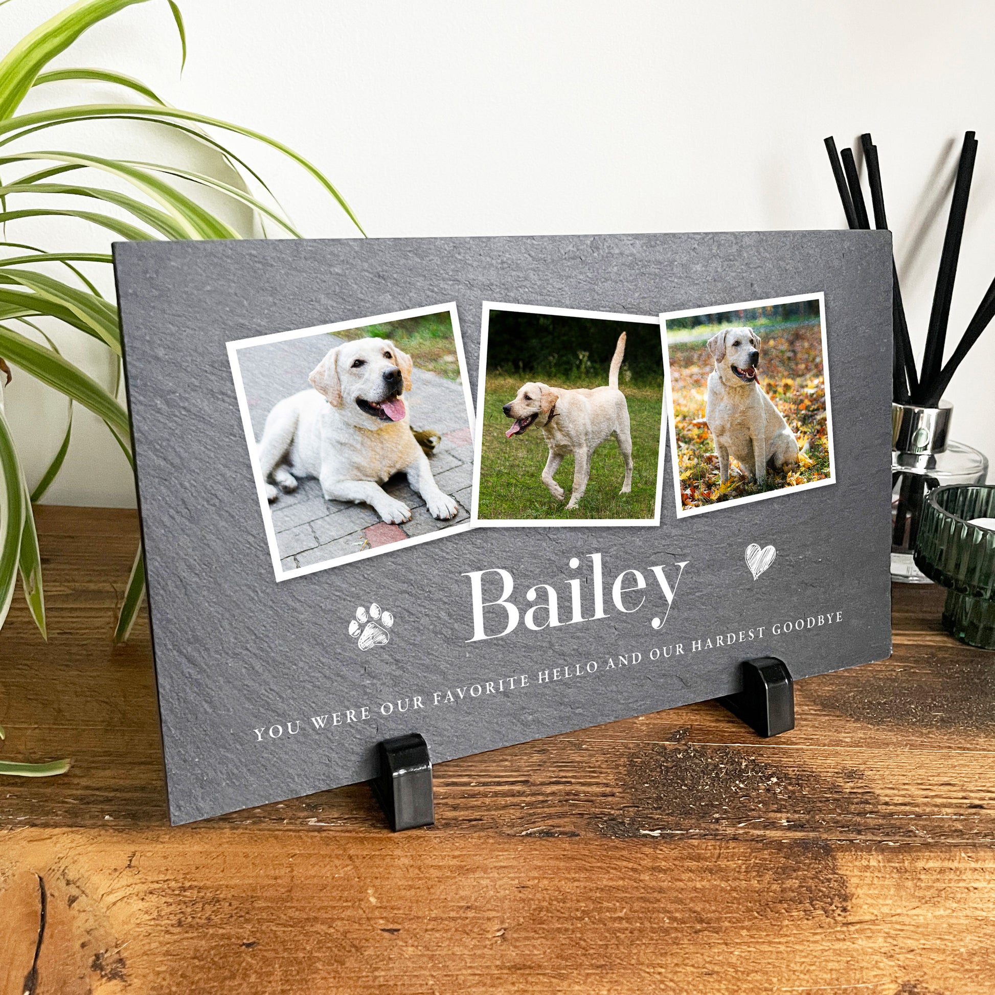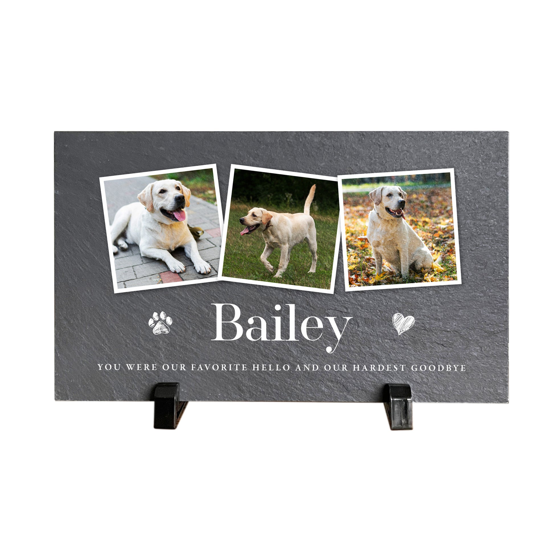 Display three treasured photos of your beloved friend, along with their name and a heartfelt message or verse, the design is printed directly onto a durable slate surface.