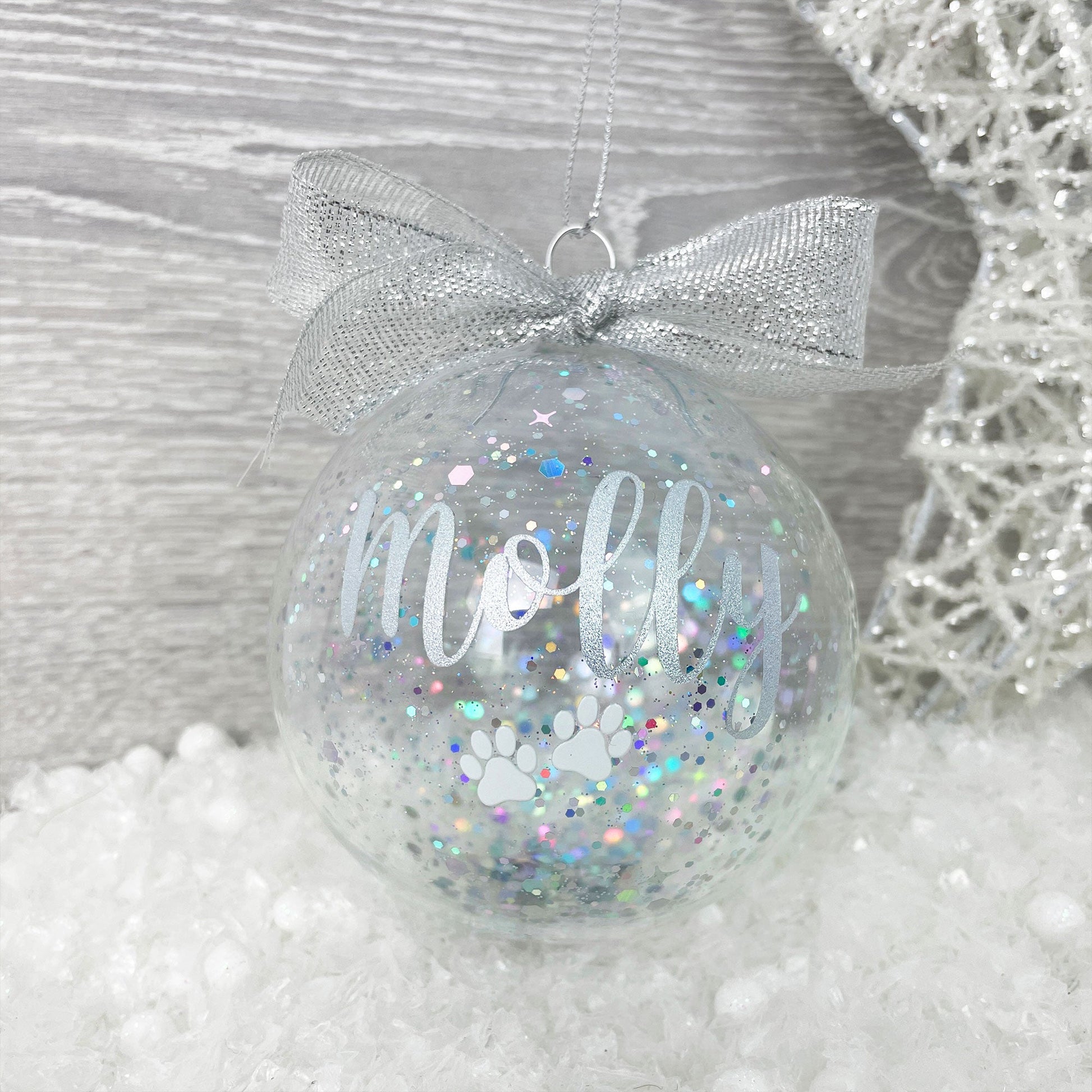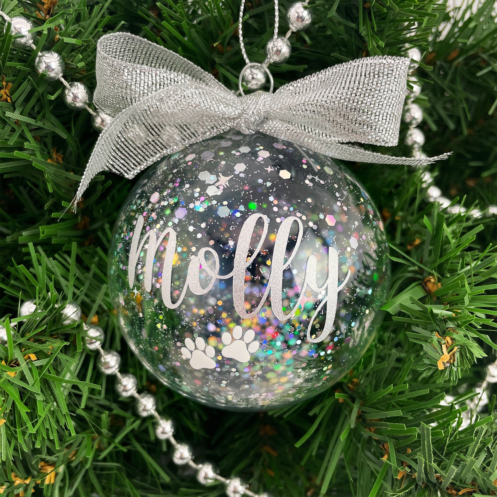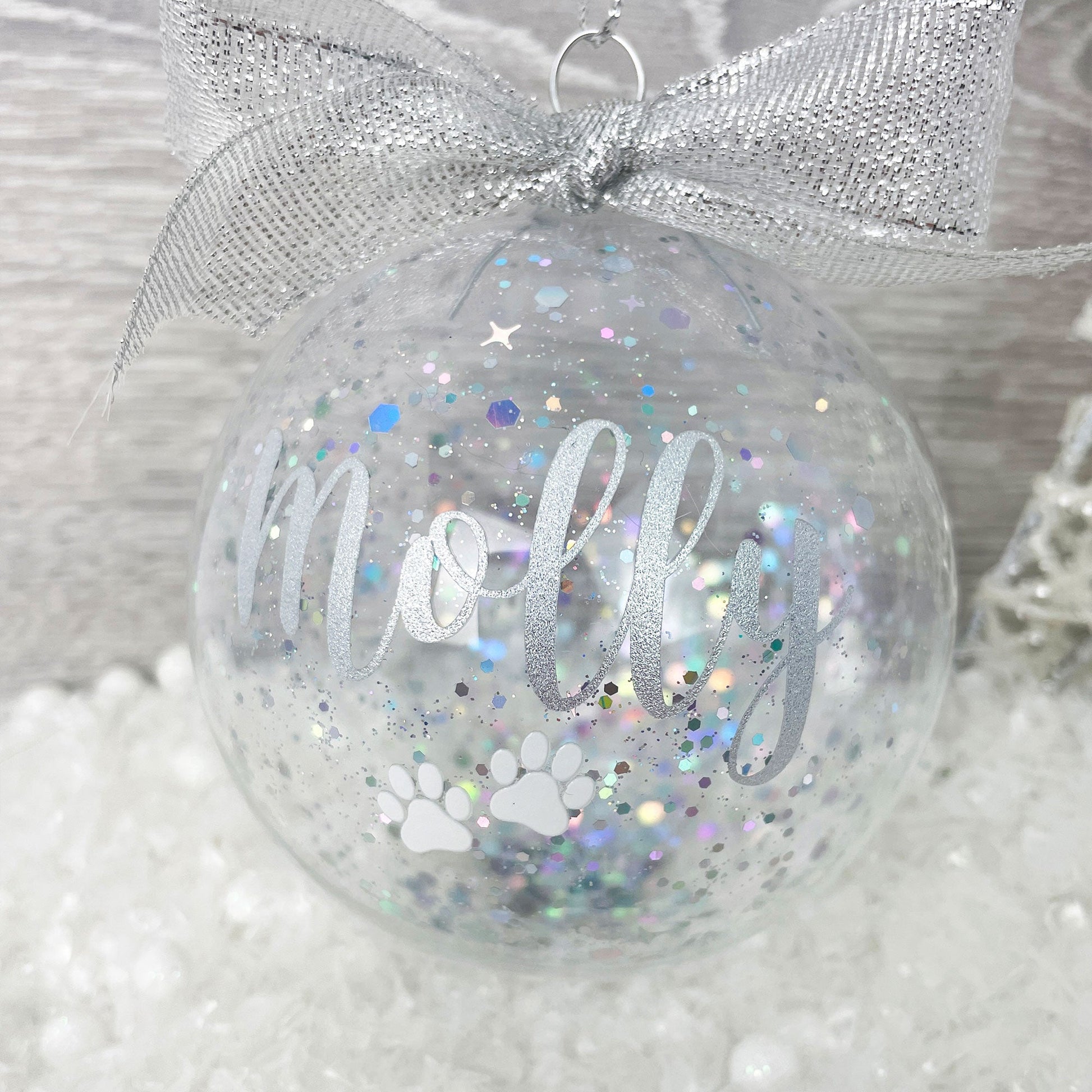Add some sparkle to your Christmas tree with this personalised pet bauble. Inside the 8cm glass bauble is the sparkliest holographic glitter, topped off with a silver ribbon.