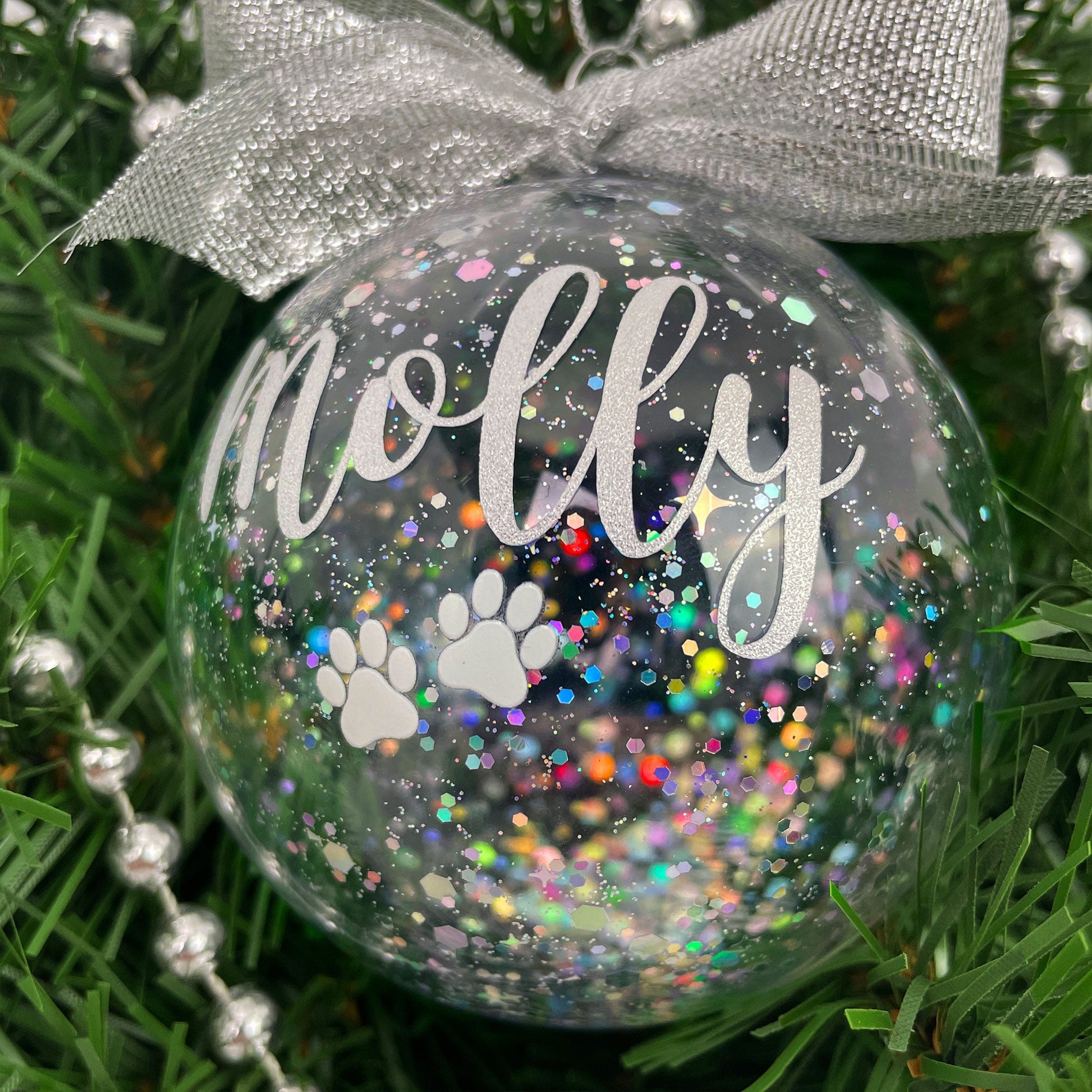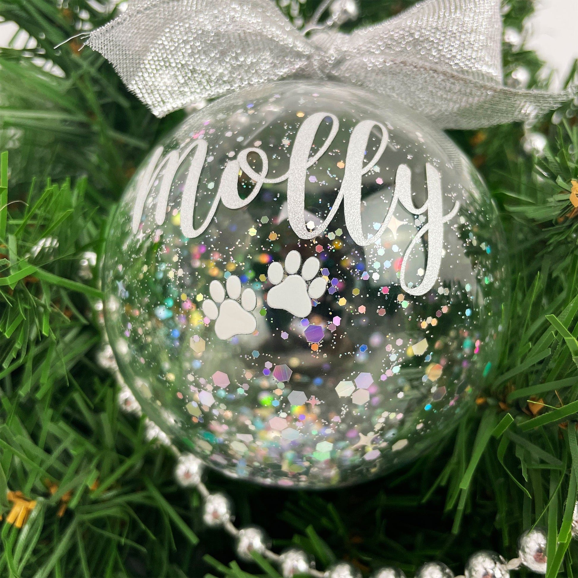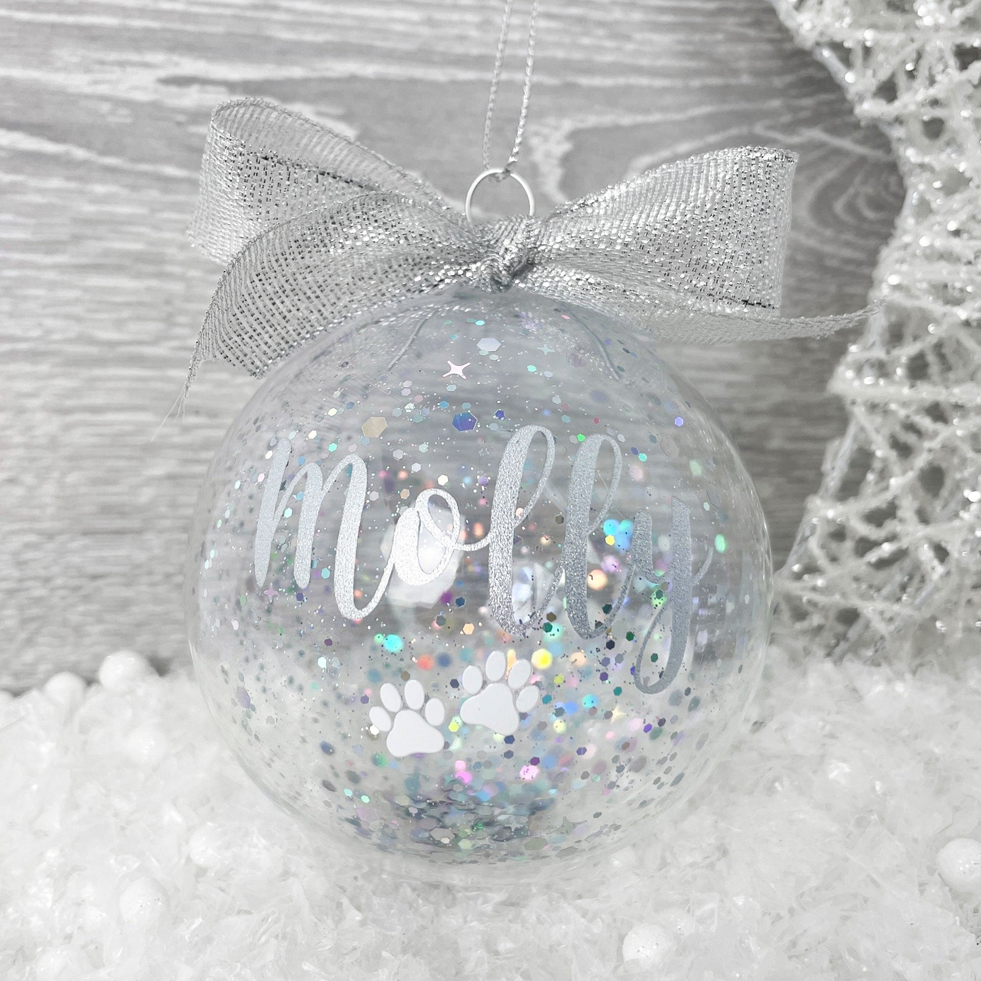 Add some sparkle to your Christmas tree with this personalised pet bauble. Inside the 8cm glass bauble is the sparkliest holographic glitter, topped off with a silver ribbon.