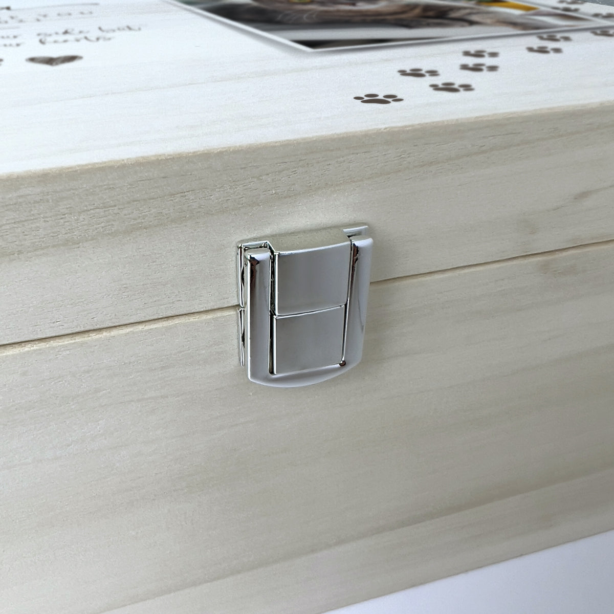 Under your pets details there is the sentimental verse "No longer by my side, but forever in our hearts" and a sketchy paw print and heart motif. As well as your beloved pets photo inside a polaroid deign, there are paw prints that run across each corner of your pets memory box.