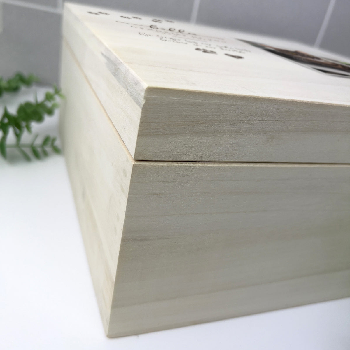 Keep all your much missed pets precious keepsakes inside this luxury square wooden keepsake memory box. You can personalise this photo memory box with any name and photo of your beloved and much missed family pet.