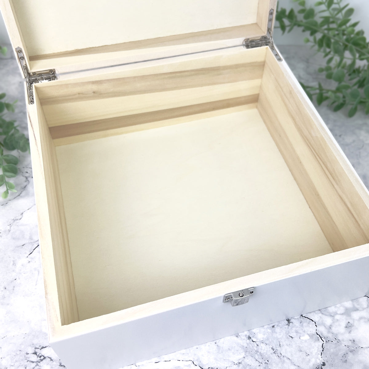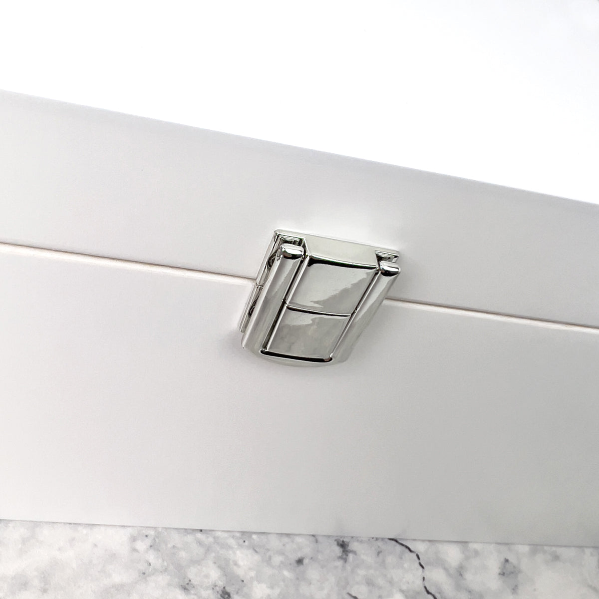 The box is made from white coated wood and is superbly finished to leave a smooth white finish. The boxes have chrome plated metal hinges and a contemporary to seal the box ensuring its contents are safe for years to come.
