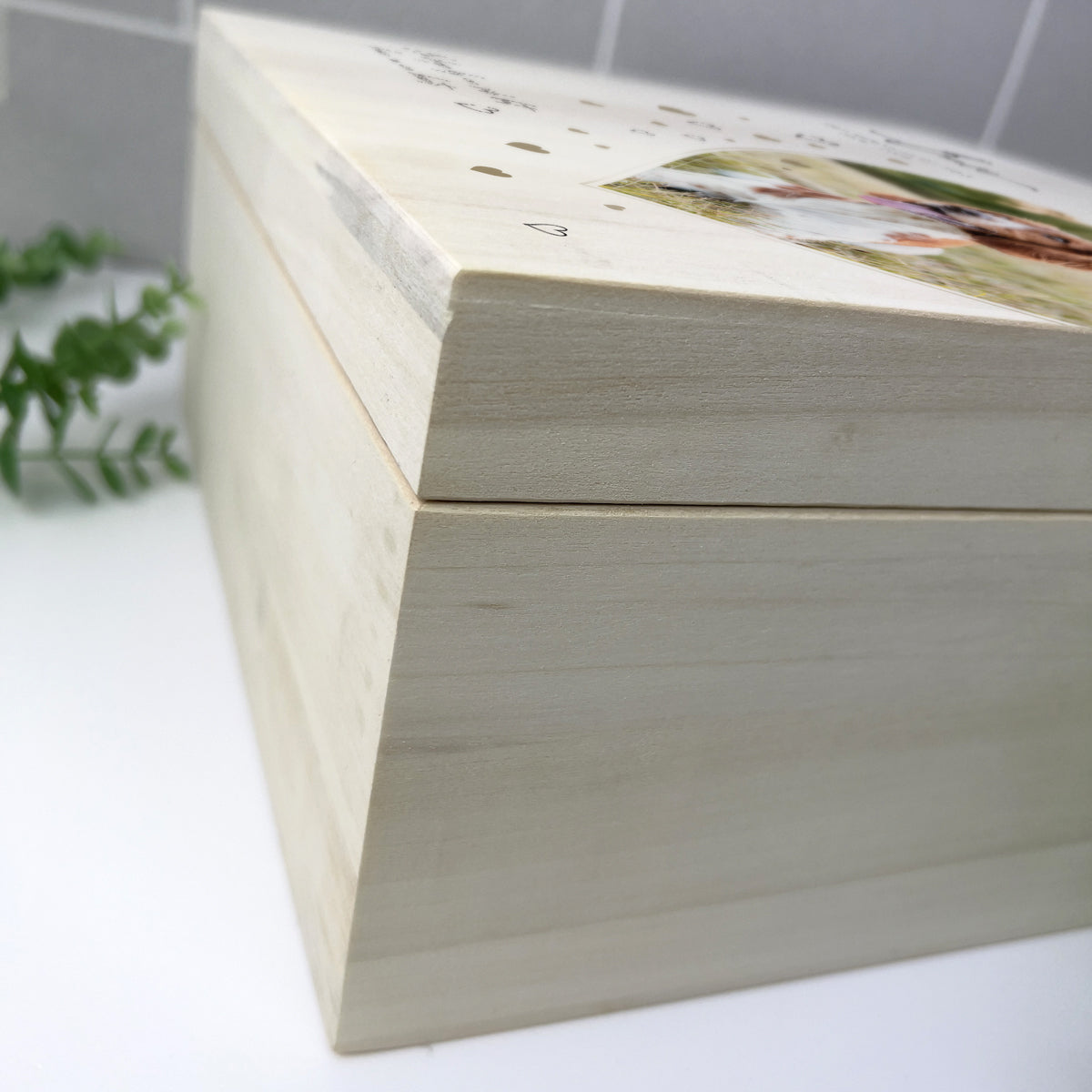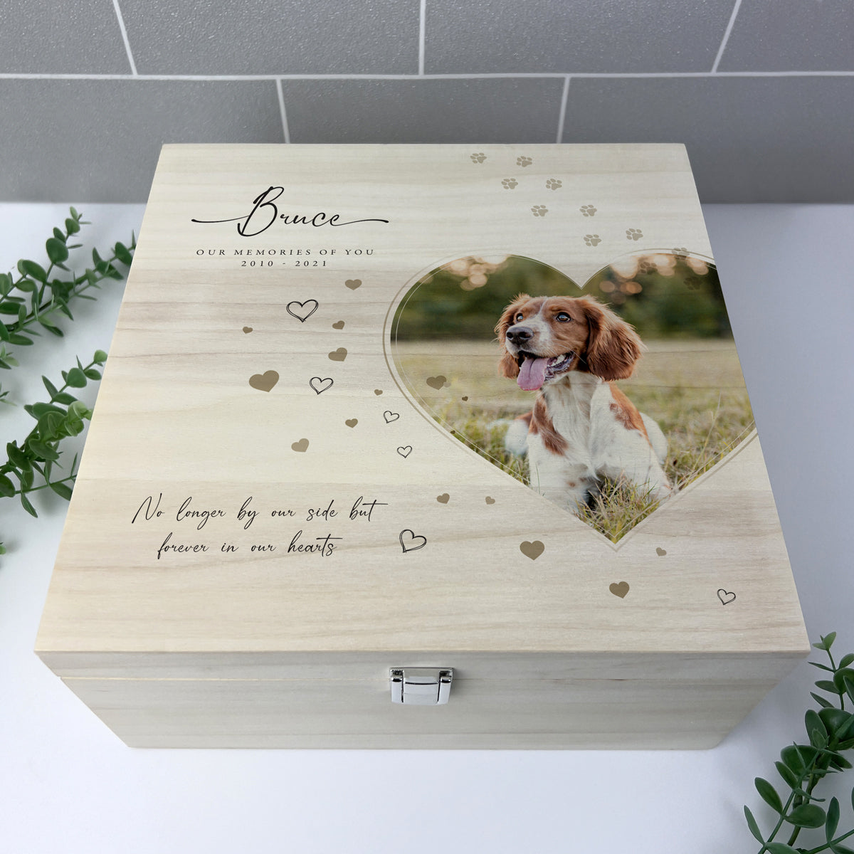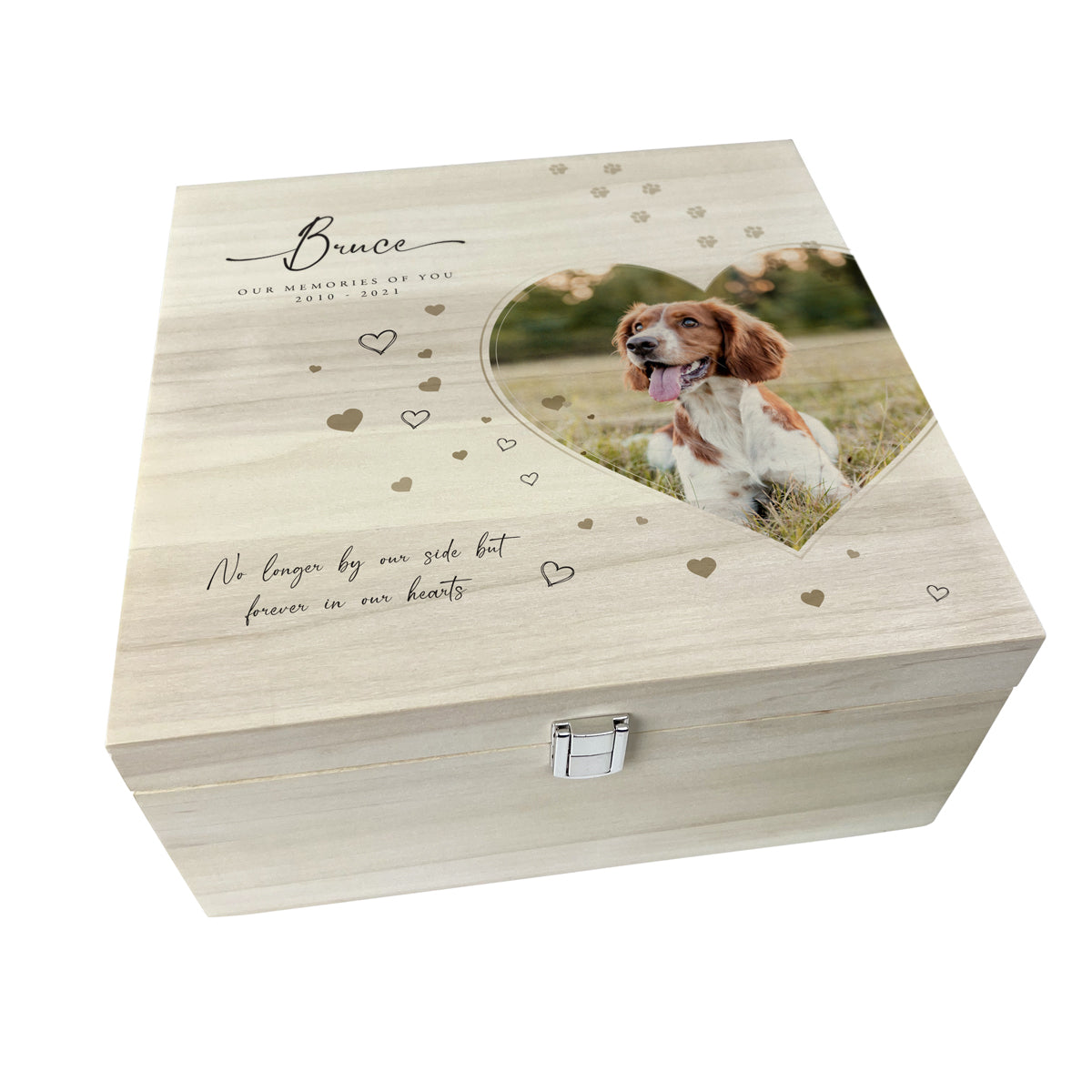 You can personalise your square memory box with any name and your favourite photo. This wooden memory box is of the highest quality, with metal hinges & a modern metal clasp. This stunning pet memory box can be personalised with your pets details: