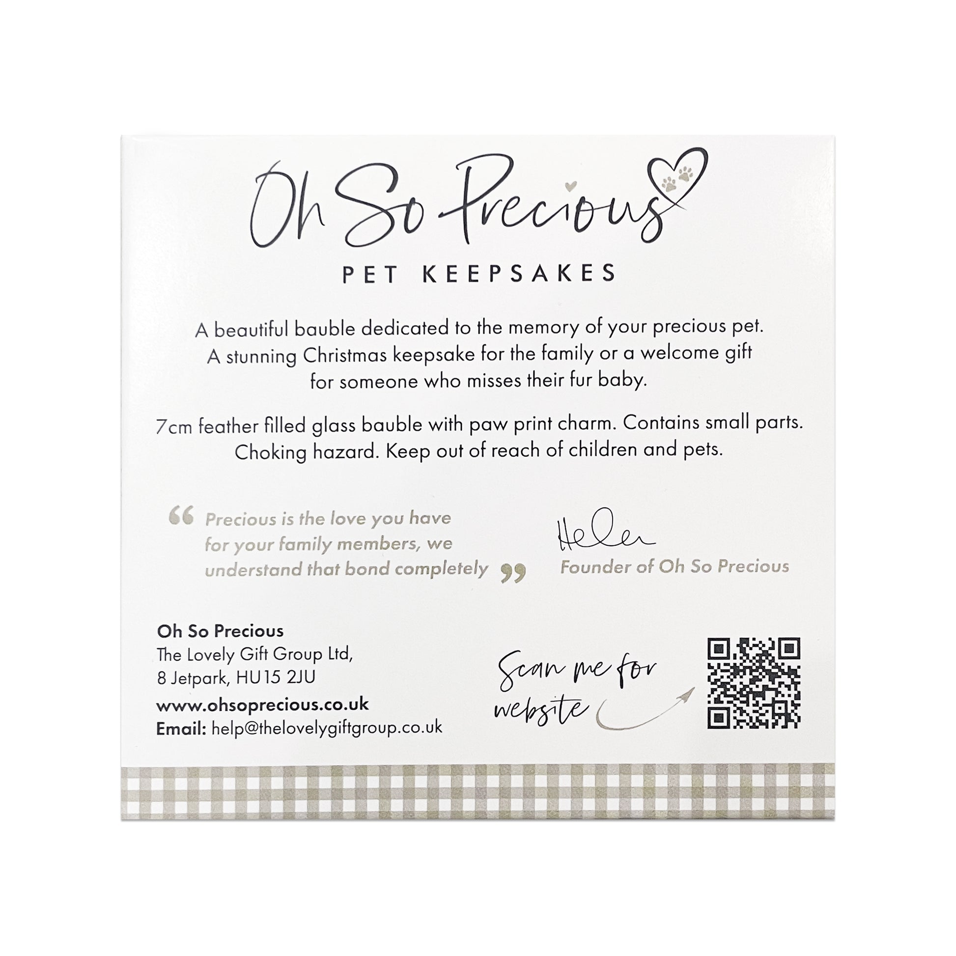Remembering a much missed family pet at Christmas time with this gorgeous pet memorial bauble. The 7cm glass bauble is filled with delicate white feathers and has a beautiful silver paw print charm hanging from the top of the bauble.