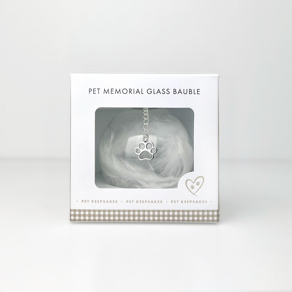 Pet Memorial Feather Filled Glass Bauble With Paw Print Charm